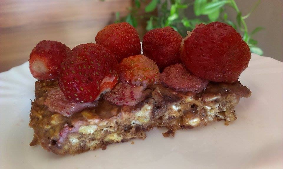 Minden hozzávalót összekeverünk és egy masszát kapunk, amit egy kisméretű tepsibe simítunk. Ezt kibélelhetjük sütőpapírral vagy bekenjünk margarinnal. 180 fokon kb. 15-20 percig sütjük, hogy még egy icipicit nyers legyen a tészta. Majd kivesszük a sütőből és eperrel telerakjuk a tetejét, amit kevés mézzel lecsurgatunk. Visszatesszük a sütőbe, és még 5 percig sütjük, hogy az eper a mézzel szépen folyó mázat képezzen és beterítse a sütink tetejét. Ha kihűlt még félbevágott epret tehetünk a tetejére. Jó étvágyat 🙂